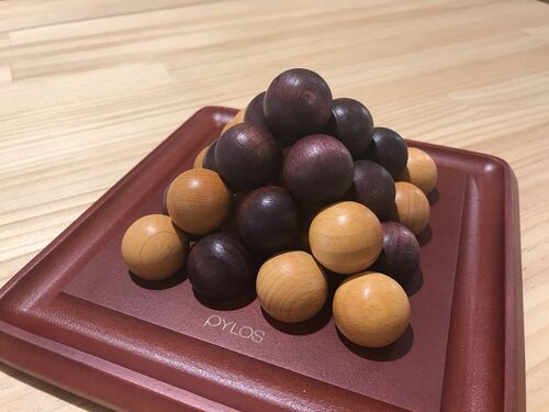 簡単なボードゲーム紹介その298【ピロス】 自分の色のボールをピラミッド状に置いていき頂点に自分の色のボールを置くことを目指す2人用のボードゲームです。 ボールを置く以外にある2つのルールが、ゲームに勝つために重要になります。 ・自分の色のボール…